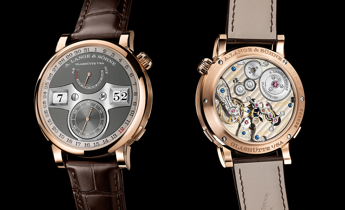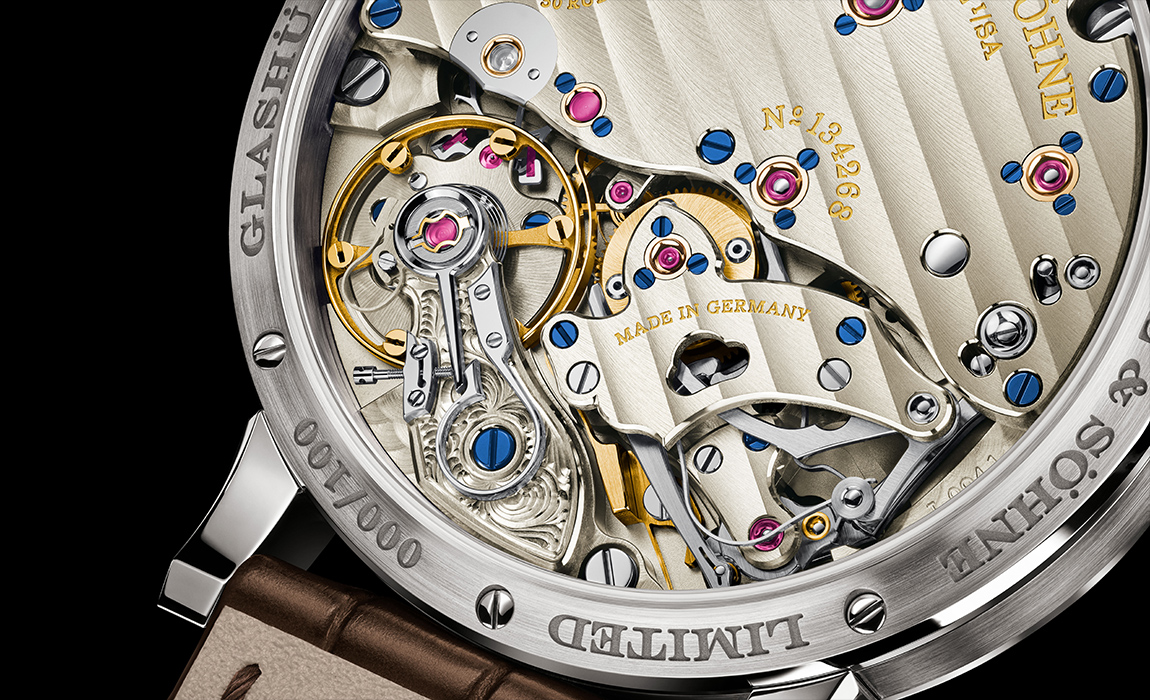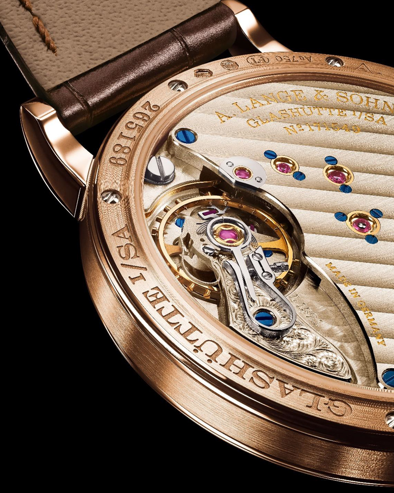 サファイアクリスタルのケースバックからは、390個の部品で構成されたA.ランゲ&ゾーネ自社製造の手巻きムーブメント「Cal.L094.1」が観察可能。そこでは動力制御ゼンマイが1秒ごとにツインバレルから新しいエネルギーを受け取って輪列に伝達する様子を見ることができる。