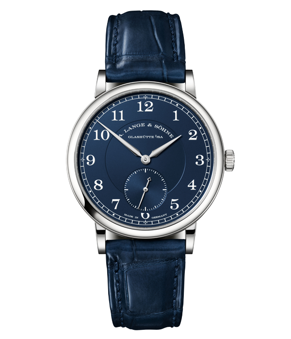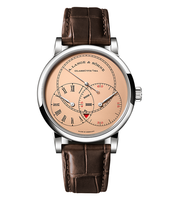 インデックスはアラビア数字を採用。鉄道線路を思わせることから「レイルウェイ」と呼ばれる分の目盛りや6時位置の大ぶりなスモールセコンドがA.ランゲ&ゾーネがかつて製造した懐中時計を思わせる。