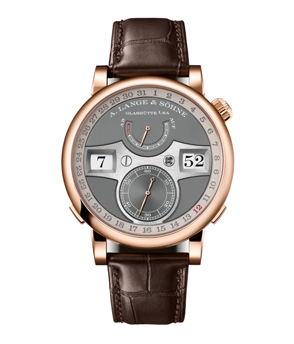 A.ランゲ&ゾーネを代表する機械式デジタル表示モデル「ツァイトヴェルク」のコレクションに新たなモデルが登場。従来、ダイアル外周のデイト表示というと、そこに記された日付の数字を針が回転して指し示す「ポインターデイト(指針式日付表示)」が通常だが、2019年発表の「ツァイトヴェルク・デイト」では、ダイアルの外周に1から31までの数字がプリントされたガラス製の日付リングを装備し、リングの下にある小さな赤色のパーツが深夜0時に瞬時に作動して次の日付を示すという画期的なシステムが開発された。この「ツァイトヴェルク・デイト」の誕生から6年後、グレーのダイアルを装備する18Kピンクゴールドのモデルが誕生。これは18Kピンクゴールドのケースにグレーのダイヤルを組み合わせたツァイトヴェルクファミリーでは初めてのモデルとなっている。