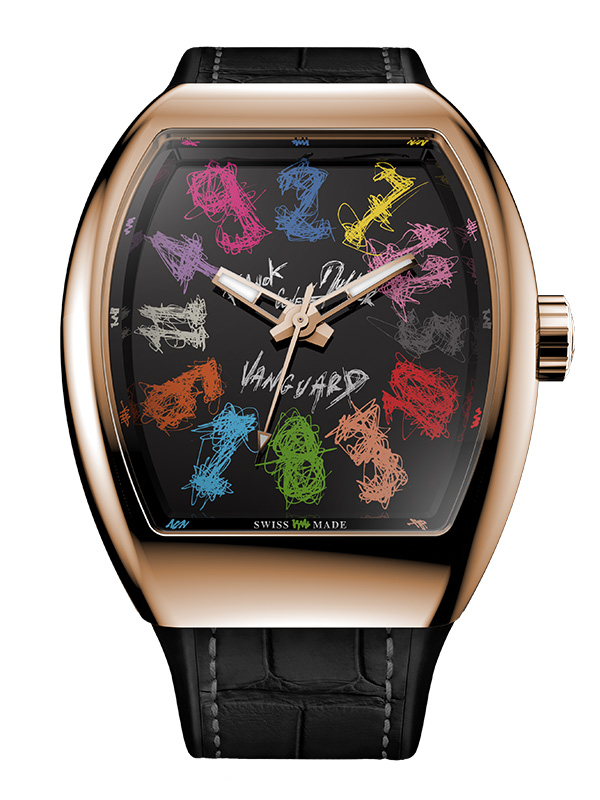 今回のコラボレーションでは、「クレイジー アワーズ」の象徴的なインデックス数字をホム グエンの複雑で繊細な線により描き出しています。まっさらな文字盤に配置された表情豊かな数字と、インナーベゼルのデフォルメされたアワーマーカーが目に見えない時間の存在を新たなスタイルで表現します。時間に対する慈しみという、フランク ミュラーが腕時計づくりを通して形作ってきた普遍的なテーマを、現代アーティストの手によってより鮮やかに浮かび上がらせています。