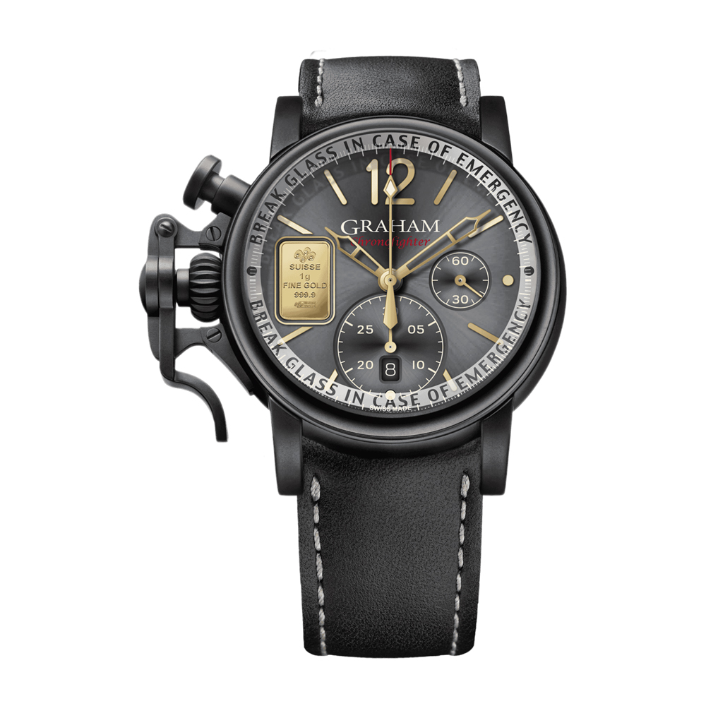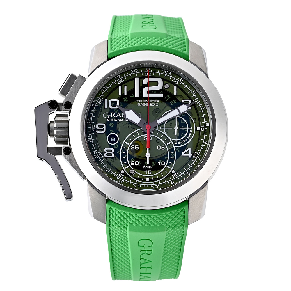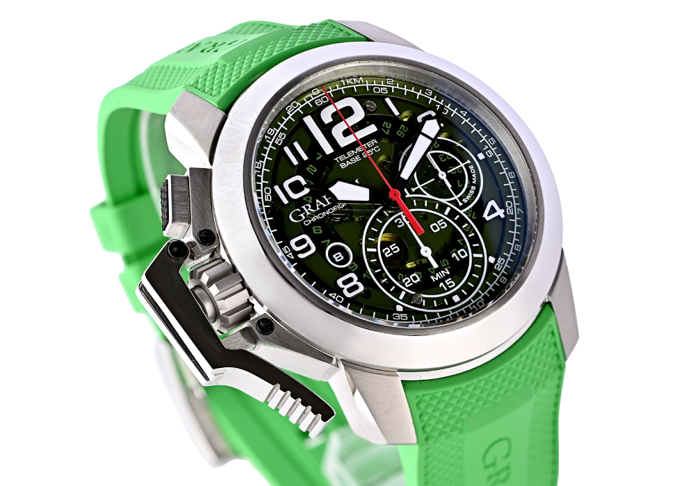 最大の特徴は、44mmを超える大型ケースと、左側に大胆に備えられた独自のビッグトリガー機構。瞬時の操作性を追求したこの構造は、視覚的インパクトだけでなく、実際に“押して使う楽しさ”をもたらします。見るための時計ではなく、触れて体感するクロノグラフ。それがグラハムの真骨頂です。
