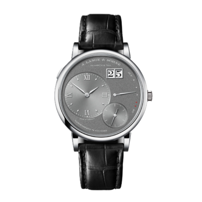 ムーブメント 手巻き ケース素材 18Kホワイトゴールド ベルト素材 グレー, アリゲーターレザー ケースサイズ 36.8 mm 防水 3気圧 パワーリザーブ 72 時間 文字盤 グレー ガラス サファイアクリスタル ほっそりとした腕元にもフィットするリトル・ランゲ1は、クラシックモデルのランゲ1よりも一回り小さいものの、機構とデザインにおいて一歩も引けを取りません。このホワイトゴールドモデルでは、グレーのゴールド製ダイヤルにギョーシェ装飾が華やかさを添えています。