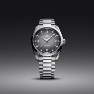 赤のオメガロゴ入り、ロジウムプレート仕上げ。