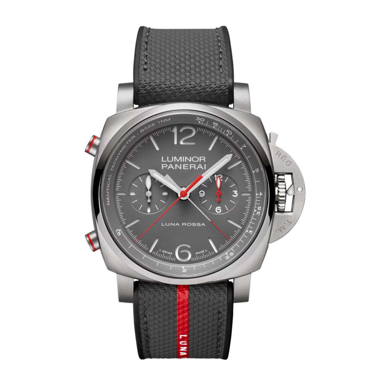 ムーブメント 自動巻き ケース素材 サテンチタン ベルト素材 ルナ・ロッサ グレーのバイマテリアル ケースサイズ 44mm 防水 10気圧 パワーリザーブ 72時間 文字盤 グレー、サンドイッチ構造、マット仕上げにホワイトのスーパールミノバ®アラビア数字とアワーインデックス