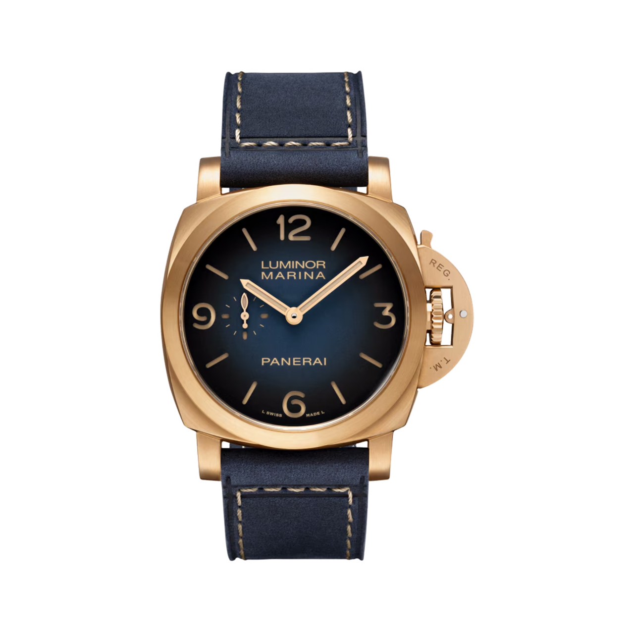 ムーブメント 自動巻き ケース素材 サテンブロンズ ベルト素材 ダークブルー カーフ ケースサイズ 44mm 防水 50気圧 パワーリザーブ 3日間 文字盤 ブルーのマットサンドイッチケースに、ベージュのスーパールミノバ®アラビア数字とアワーマーカーを配しています。9時位置にスモールセコンド 備考 ブティック限定