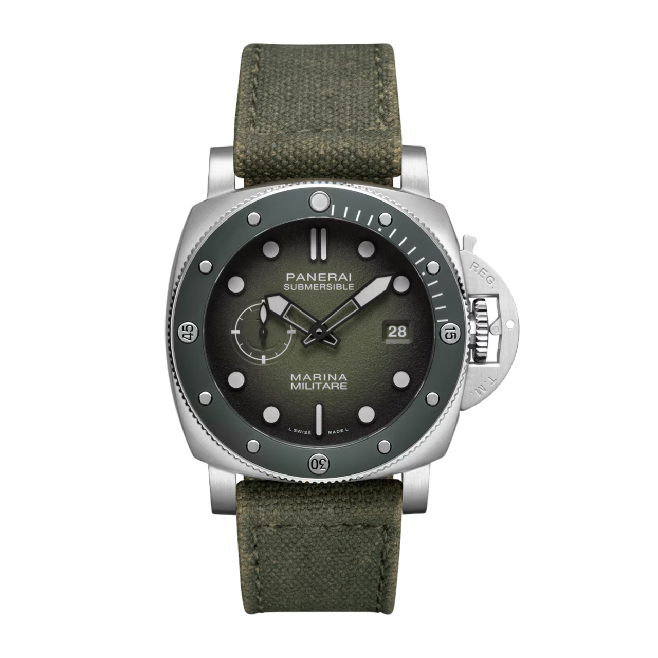 ムーブメント 自動巻き ケース素材 サテンスティール ベルト素材 ダークグリーン テキスタイル ケースサイズ 44mm 防水 30気圧 パワーリザーブ 72時間 文字盤 グリーンのマットグレイン仕上げ、ブラックのグラデーション仕上げにグレーのスーパールミノバ® グレードX2のアワーインデックスとドット