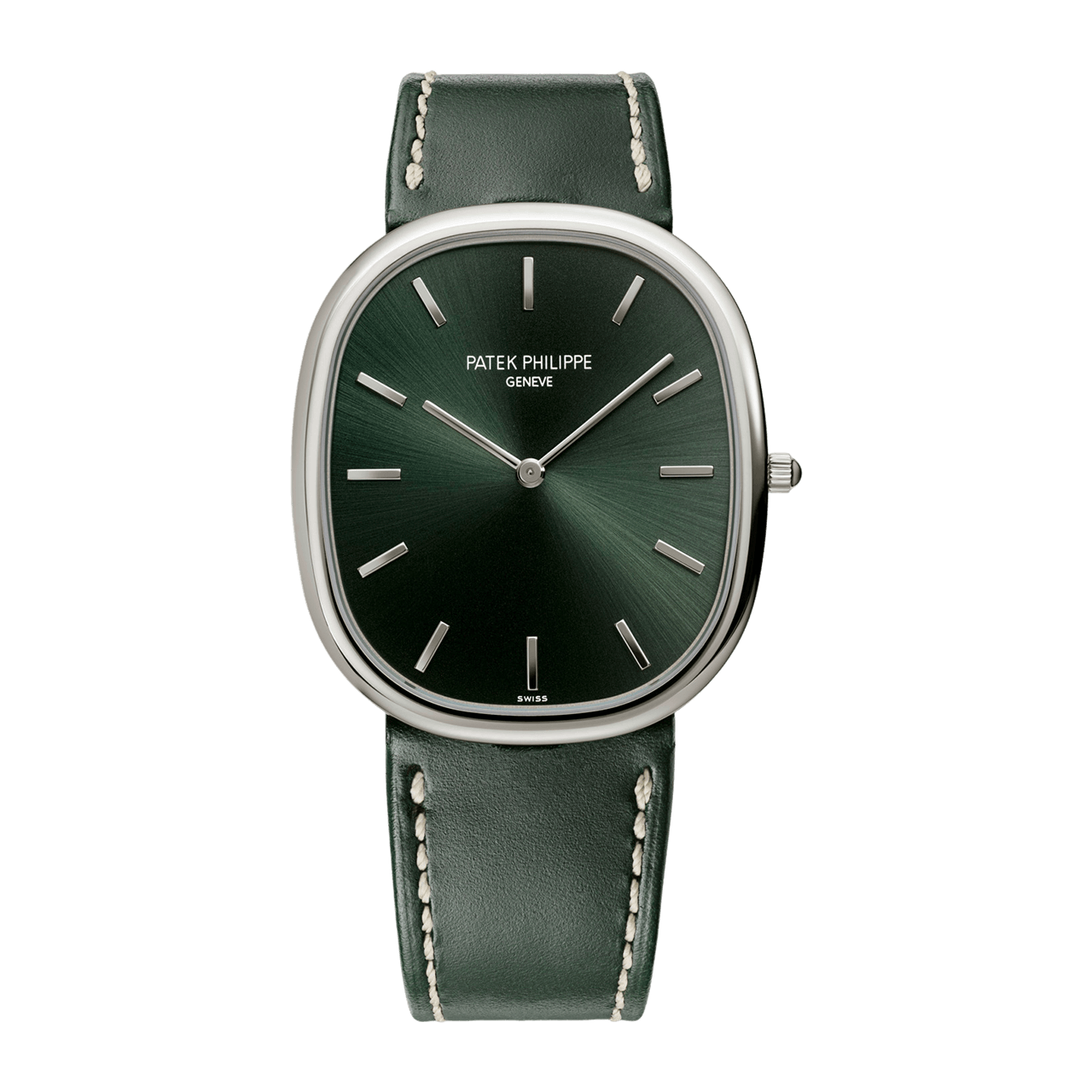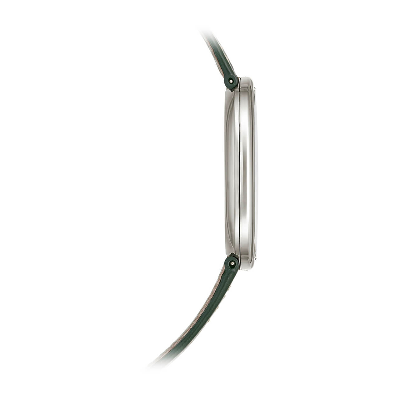 ムーブメント 自動巻 ケース素材 ホワイトゴールド ベルト素材 カーフスキン、ブリリアント・オリーブグリーン。ホワイトゴールド・ピンバックル ケースサイズ 34.5 x 39.5mm 防水 3気圧 パワーリザーブ 最小48時間 文字盤 オリーブグリーン・ソレイユ、ホワイトゴールドの植字バトン型アワーマーカー。18金ゴールド文字盤プレート。ホワイトゴールドのシュヴェー型時・分針