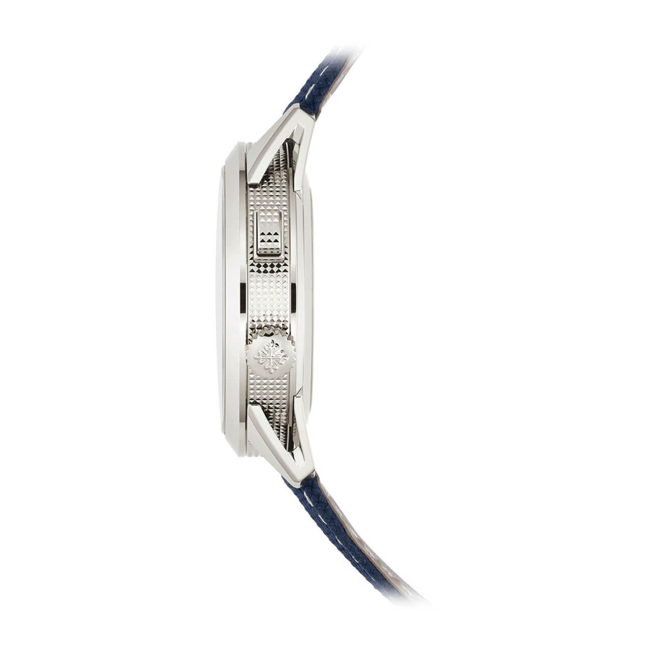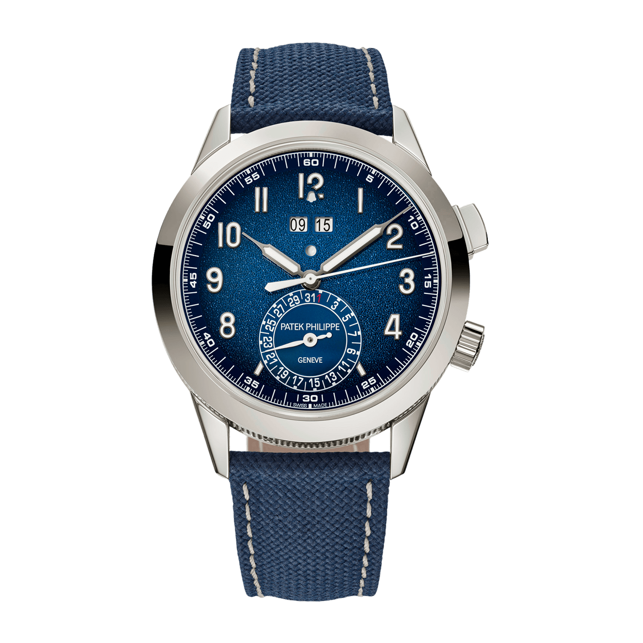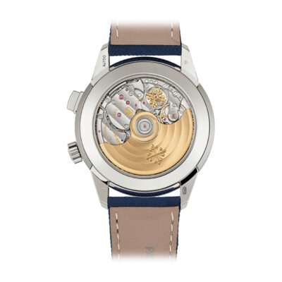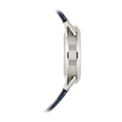 ムーブメント 自動巻 ケース素材 ホワイトゴールド ベルト素材 コンポジット、ファブリック柄、ネイビーブルー。カーフスキン、ヌバック仕上げ、ベージュ(同梱)。特許取得の3ブレード・ホワイトゴールド折り畳み式バックル ケースサイズ 41mm 防水 3気圧 パワーリザーブ 最小42時間、最大52時間 文字盤 外周に向かって濃くなるブラック・グラデーションのテクスチャード・ラック・ネイビーブルー、夜光付ホワイトゴールド植字数字。夜光付ホワイトゴールド・シリンジ(注射器)型時・分針