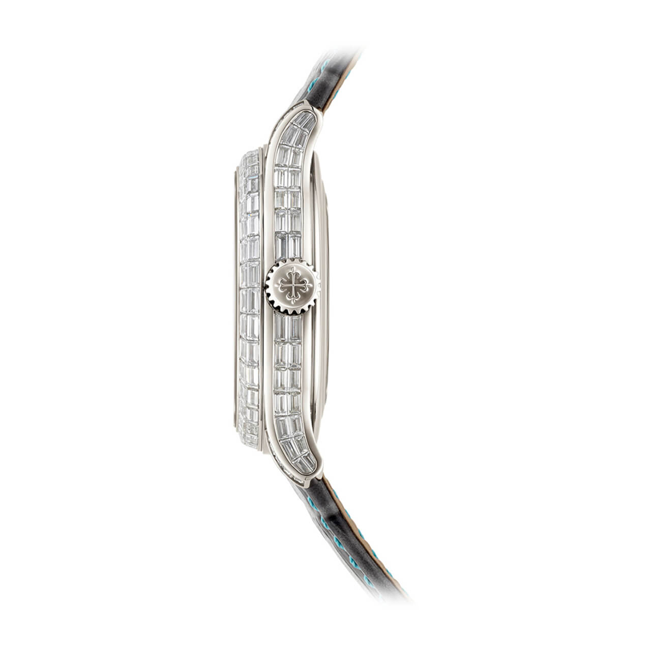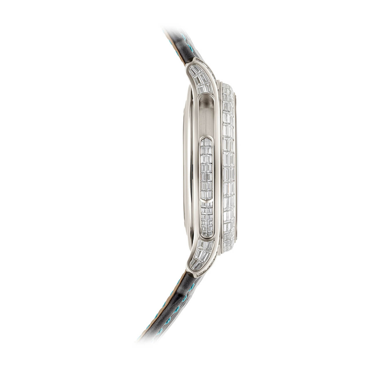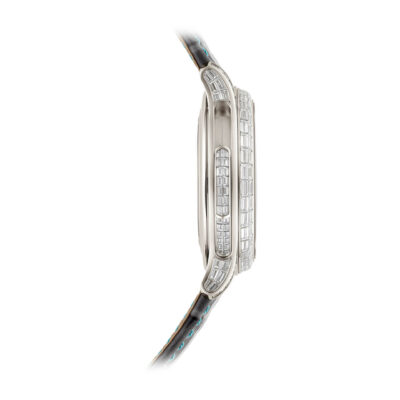 ムーブメント 自動巻 ケース素材 プラチナ ベルト素材 カーフスキン、アリゲーター・エンボス・パターン、ブリリアント・スレートグレー。36個のバゲットカット・パライバトルマリン(0.17カラット)をセッティングした特許取得の3ブレード・プラチナ折り畳み式バックル ケースサイズ 42mm 防水 非防水(湿気・埃にのみ対処) パワーリザーブ 最小38時間、最大48時間 文字盤 パリ産のホワイト・マザーオブパール、バゲットカット・ダイヤモンド付アワーマーカー、バゲットカット・パライバトルマリン分マーカー。18金ゴールド文字盤プレート。ホワイト夜光付のホワイトゴールド・リーフ型時・分針