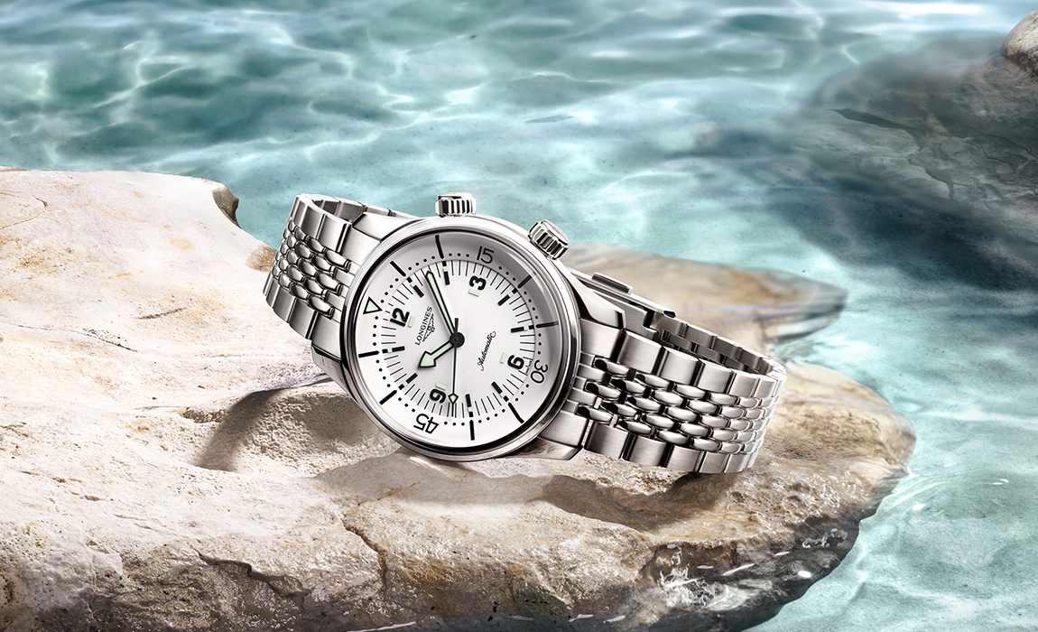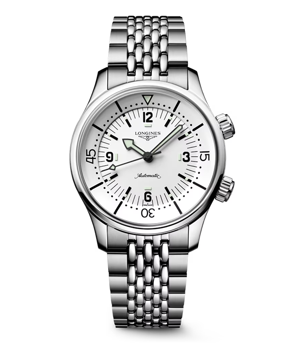 1959年に誕生したロンジンの傑作ダイビング・ウォッチを現代に蘇らせた「ロンジン レジェンドダイバー」は、その美しいタイムレスなデザインによって、水中のみならずファッショナブルなスポーツ・ウォッチとしても高い人気を獲得している。このモデルは39mmという絶妙なサイズのケースと、そこに収められた「マットホワイト」のダイアルが特徴。混じりけのないクリーンな白が、ダイバーズウォッチの力強さに洗練された気品を添えている。