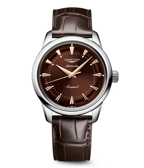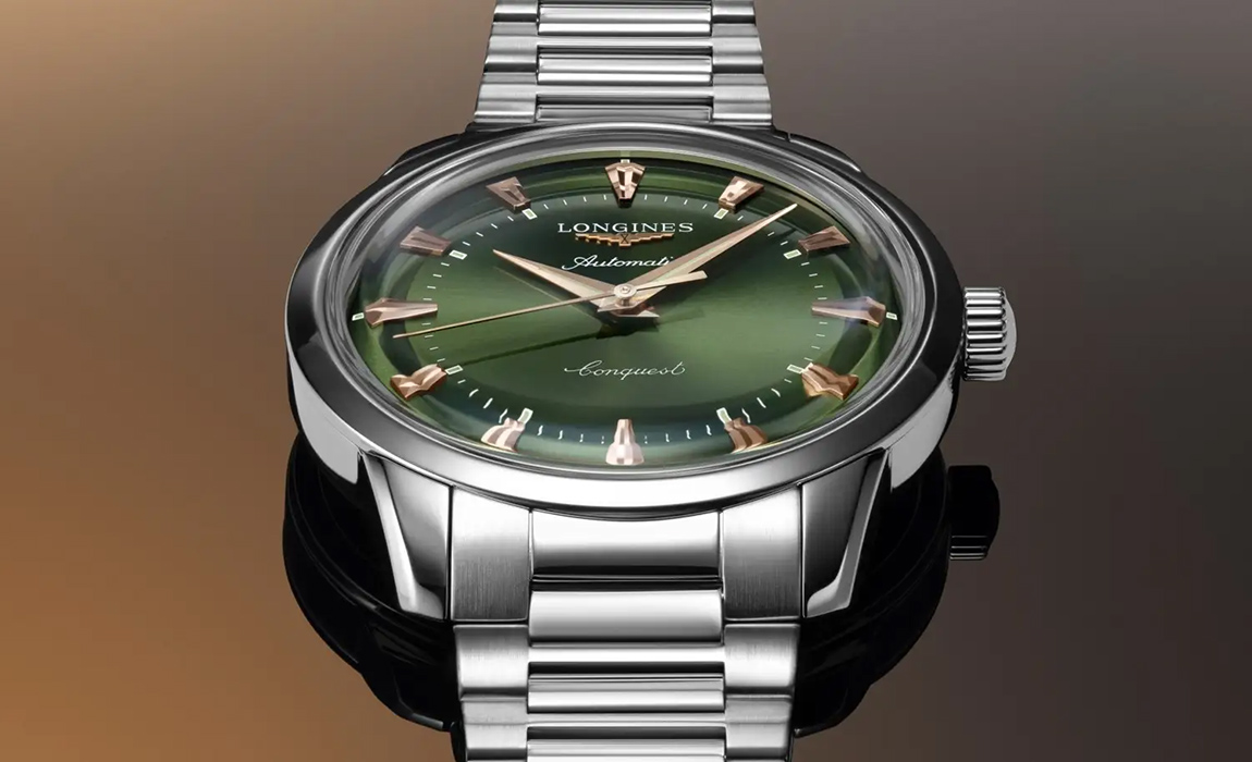 1954年、スイス連邦知的財産局によってその名が保護されたロンジン初のコレクションが「コンクエスト」である。その初代モデルに敬意を評して開発された「コンクエスト ヘリテージ」のシリーズは、ケース径38mmというコンパクトなサイズと、伝説のモデルを彷彿とさせるゴールドカラーの彫りの深いクサビ型インデックスとグリーンのラッカーで仕上げられたダイアルとのコンビネーションにより、その価値と偉大さを今に伝えてくれる貴重な存在である。