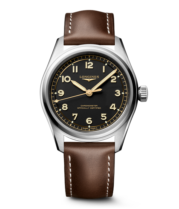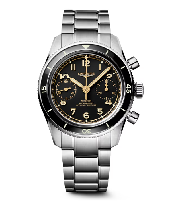 水平に並んだふたつのインダイアル(3時位置に30分積算計、9時位置にスモールセコンド)がレトロな雰囲気を醸し出す「ロンジン スピリット パイロット フライバック」。1回のプッシュボタン操作で時間計測の停止とリスタートが行えるフライバック機能搭載のクロノグラフには、1930年代初頭にフライバック機能を搭載する最初のモデルを発表し、1936年6月16日にはその特許を取得したロンジンの先駆的な専門技術が息づいている。また、搭載される「Cal.L3.721.4.53.6」は手巻き仕様。着用の前にリューズを巻き上げてクロノグラフに命を吹き込む作業は、時計愛好家にとって至福のひとときとなるに違いない。