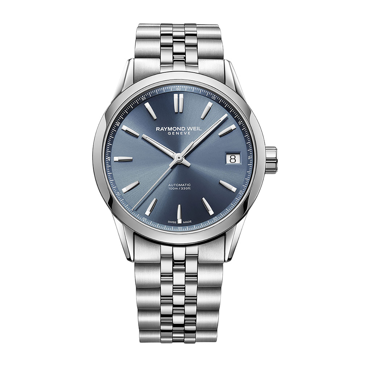 クリーンで爽やかな印象のブルーダイアル。ダイアル中央は、太陽光線のように中央から放射状の筋目が広がるサンレイ仕上げ。外周部は、同心円状の紋様が刻まれたスネイル仕上げ。異なる仕上げが色味と高さに変化をもたらし、奥行きのある表情を作り出しています。3針とアプライド仕様のバーインデックスは光沢の強いシルバーで、ケース・ブレスレットと調和しています。日常生活に便利な日付表示付きです。