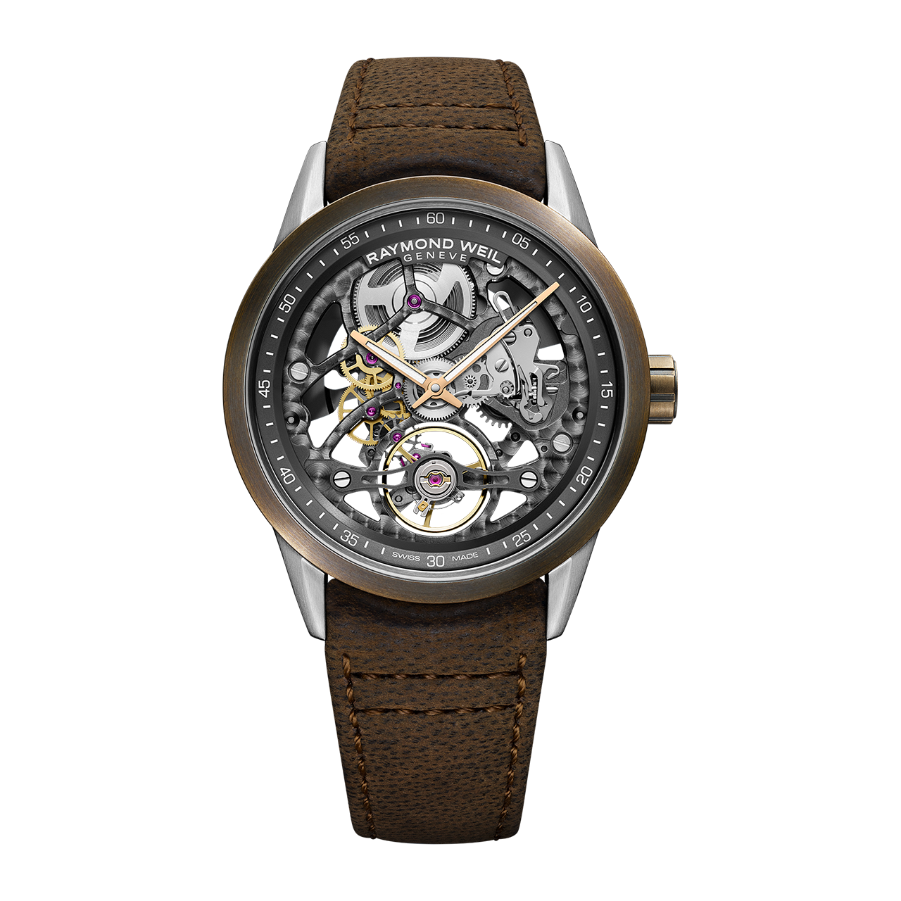 ¥638,000(税込)ムーブメント 自動巻き ケース素材 ステンレススティール、ブロンズベゼル ベルト素材 カーフストラップ ケースサイズ 42mm 防水 10気圧 パワーリザーブ 約41時間 文字盤 グレー ガラス サファイアクリスタル レイモンド ウェイル専用ムーブメント(Cal.RW1212)を堪能できるスケルトン仕様の「フリーランサー」。クリエイティビティのテーマを「ミュージック&アート」とするレイモンド ウェイルは、骨董品などの芸術作品にも使われるブロンズ素材を、プロダクトに新たな息を吹き込むエッセンスとしてベゼルに採用しました。高度な技術で削り出すことによって作られた、独特な輝きを放つブロンズベゼルは、酸化によって少しずつ色合いが変わっていきます。過ごす環境によってどのように経年変化するかが異なるため、その度合いやスピードは一定ではなく、身に着ける人によってそれぞれです。着用を続けることにより、まるで1点もののユニークピースかのようにお楽しみいただけます。お問い合わせ|03-5860-3617